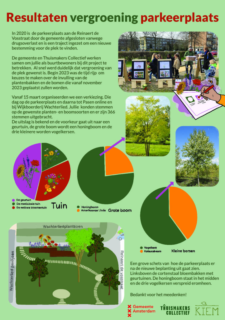De gemeente en Thuismakers Collectief werken samen om de buurtbewoners bij dit project te betrekken. Al snel werd duidelijk dat vergroening van de plek gewenst is. Begin 2023 was de tijd rijp om keuzes te maken over de invulling van de plantenbakken en de bomen die inmiddels geplant zijn.