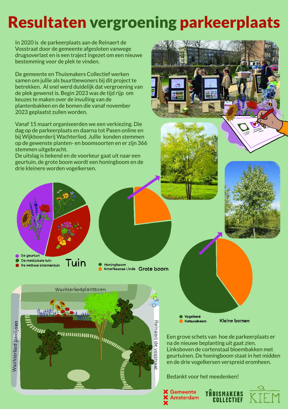 Vanaf 15 maart organiseerden we een verkiezing. Die dag op de parkeerplaats en daarna tot Pasen online en bij Wijkboerderij Wachterlied. De buurt kon stemmen op de gewenste planten- en boomsoorten en er zijn 366 stemmen uitgebracht.